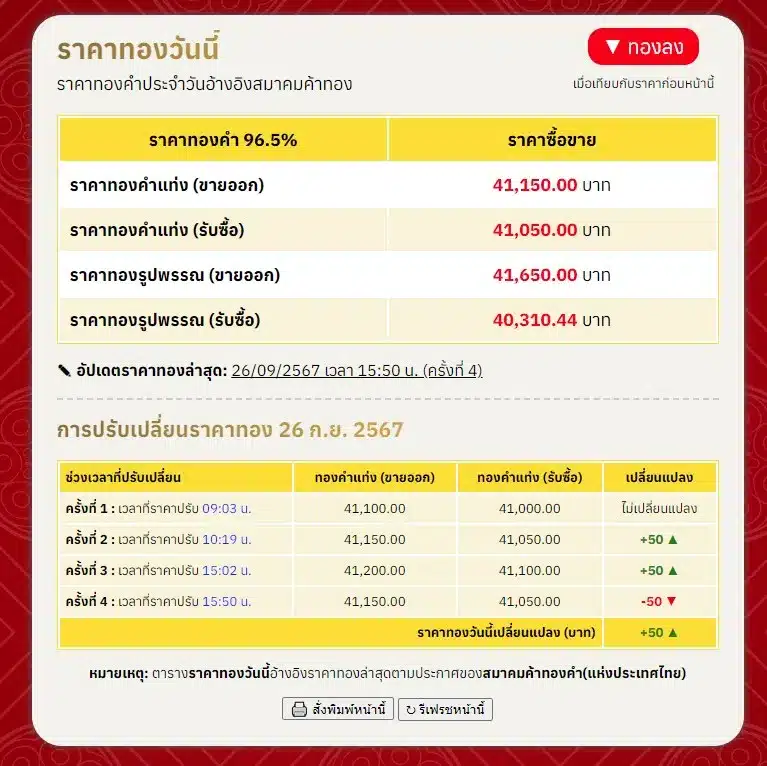 ราคาทองคำอ้างอิงสมาคมค้าทอง ประจำวันที่ 26 กันยายน 2567 ราคาทองคำแท่ง ขายออก ที่ 41,150.00 บาท และรับซื้อ ที่ 41,050.00 บาท ส่วนราคาทองคำรูปพรรณ ขายออก ที่ 41,650.00 บาท และรับซื้อ ที่ 40,310.44 บาท